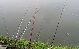 5)近距离抛线也可釆取手杆抛线方式,一手握坠,另一支手握串杆,打开线轮止线环,杆尖对准落点猛一扬杆。如果投远了,可慢慢收线至打窝点。此方法落点准,最适合梯田型接壤处水库。