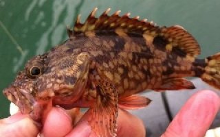地方名广东叫石狗公,浙江礁虎头鱼,褐菖鲉产于南海、东海和渤海,为我国自雷州半岛以东沿海一带常见鱼类。虎头鱼属暖温性底层小型鱼类,常栖息于近 岸岩礁海区。常见体长约100毫米左右,体重约50克-150克,属卵胎生,鱼身80%呈桔红色,犹如身披晚霞,体侧有多条不规则暗色横纹,色彩相当艳 丽。