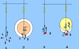 是台钓钓组钓底双脑线弯曲时的示意图,图中AB饵钩大小相同,两个钩的脑线长度不同。在这个钓组中,两个饵钩的灵敏度是不同的:当鱼等距离水平横拉A饵钩时,漂尖先不动,后能位移稍大距离,当鱼等距离水平横拉B饵钩时,漂尖先不动,后位移稍小距离;当鱼等距离上拉A饵钩时,进入小盲区范围小,当鱼等距离上拉B饵钩时,进入小盲区范围大。综合看鱼的这三种吃饵动作,还是A饵钩的灵敏度高些。