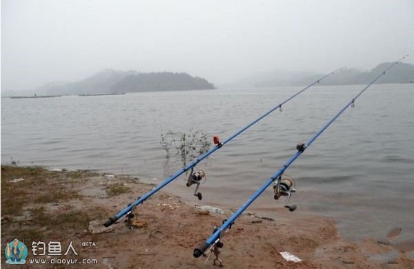 抛竿后架竿时竿尖尽量压低甚至成贴近水面,但不要放置成拔河之势。低放是为了使串钩更容易地全部触底,这样有利于鲫鱼的摄食;如果竿支得太高,钓饵都离开水 底,由于鲫鱼是底牺牲鱼类。