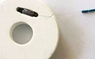 1、剪去子线,将八字环与铅皮座放入线轴的腰眼;