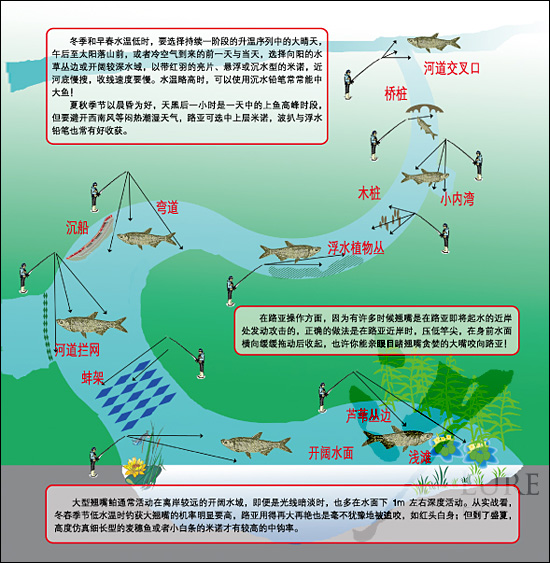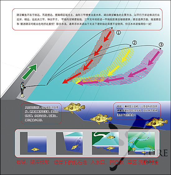 路亚鳜鱼,首先要找准标点。平坦处无鱼,鳜鱼特别喜欢障碍物区,只要水中有鳜,就必然藏身于水底乱石堆中,桥桩旁,伸入水中的树根丛,陡岸下,石堤边,大坝下等。