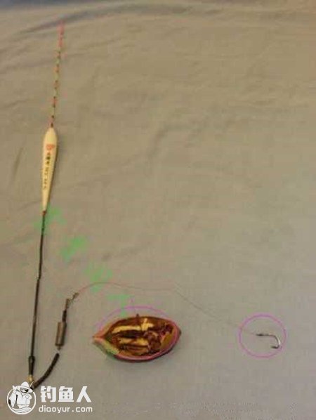 大家看看下面的图,就是这样的上饵料和垂钓钓浮方式:
