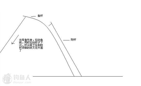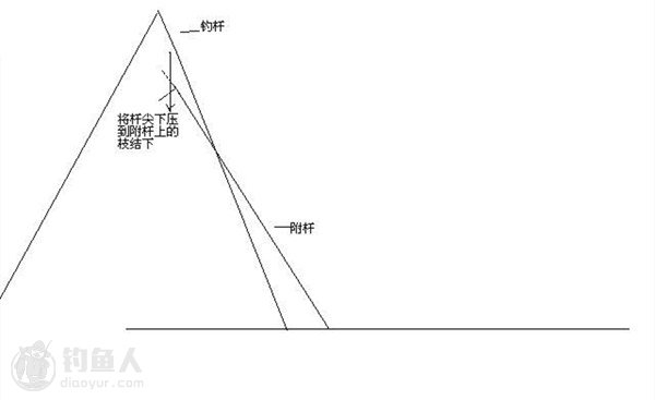 插好后,将鱼杆杆尖部下压,一直要压到附杆顶部特意留下的枝叉之下,松手后鱼杆尖就被附杆固定好了,并会弯成一定的弧度,如上图所示。