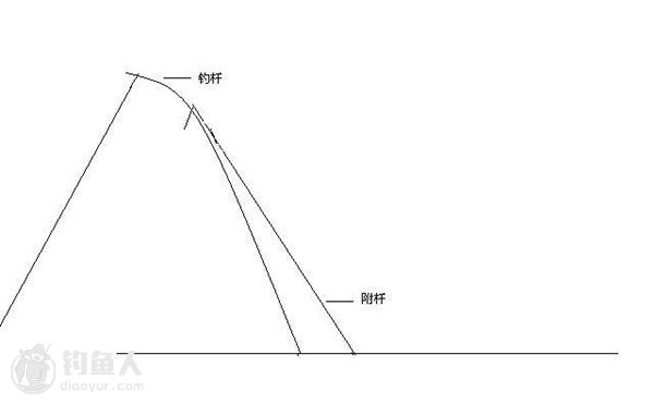 总之鱼杆和附杆做好后,要一起插在河岸上,这插杆也是有讲究的,鱼杆和附杆成X形插好,鱼杆杆尖要高于附杆,如上图所示。