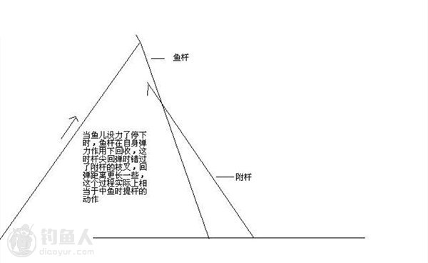 鱼儿游一会儿就游不动了,停下来,这时鱼杆在自身弹力作用下回弹,并会弹到附杆之上,回弹的距离比下压时更远,实际上是完成了提杆的动作,鱼儿就会被钩住了。