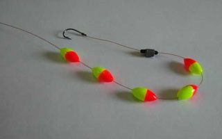1)取适当长度的钓线一根。先穿入七粒星漂,(从上往下依次为第1粒,第2——7粒。前六粒小些,第7粒稍大以平衡钓组)。接着穿入一颗太空豆,下来是穿入铅皮座,然后再穿入一颗太空豆,拴上鱼钩。