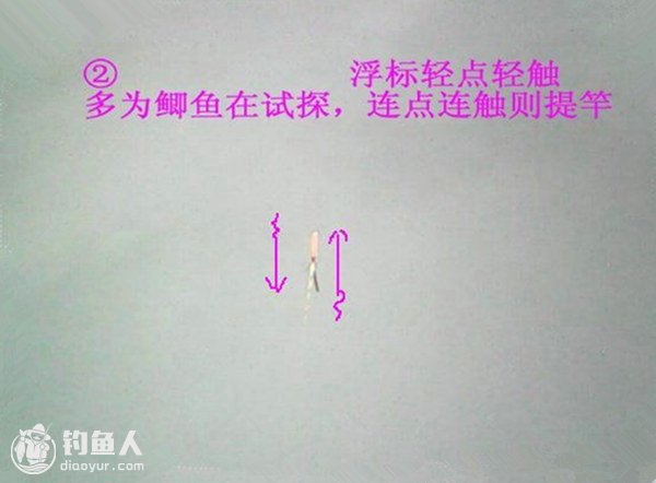 浮标轻点轻触。多为鲫鱼在试探,连点连触则提竿。在经常有人垂钓的地方,有时会出现漂尖点动一下就停,隔一会再点动一下的情况。这多数是鲫鱼被钓滑了,很谨慎,不轻易吞钩,表现为叨一口就放下,转圈回来再叨一口。发现这种现象后,垂钓时要有耐心,不要轻易提竿。否则,在鱼叨饵试探时急着提竿,它就会惊走不再回来。