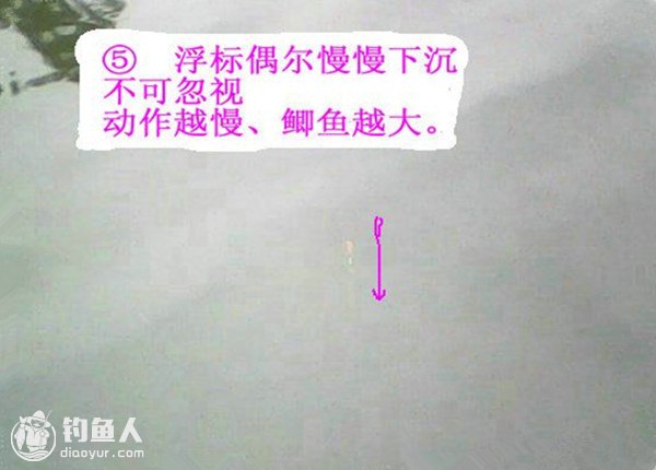 浮标下顿有力。可能只点了一下,但动作大,然后不下沉也不上送,说明鱼饵已吃到嘴里,鱼儿较大应及时提竿。