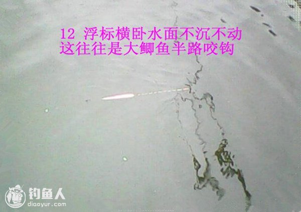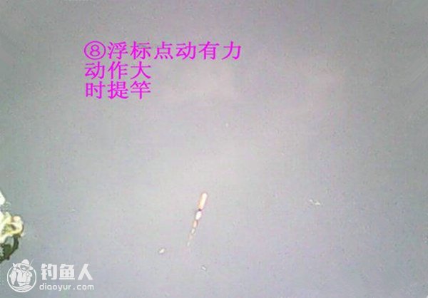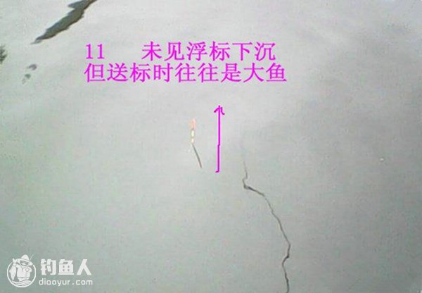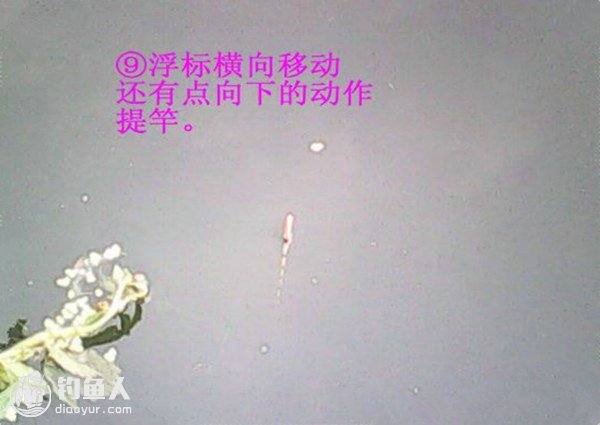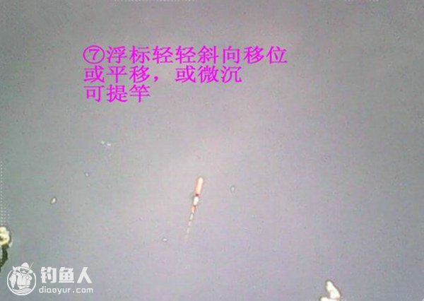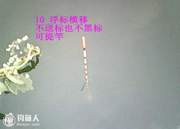 浮标横移。不送标也不黑标,只作平行横向移动,此时鱼已咬钩,可提竿。
