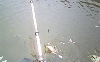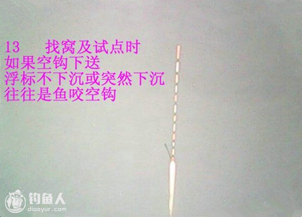 找窝及试点时,如果空钩下送,浮标不下沉或突然下沉。往往是鱼咬空钩,及时提竿。(情况较少)