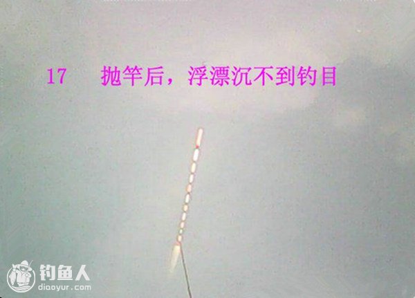 抛竿后,浮漂立直下沉,但却沉不到钓目, 也不见上浮或移位。这可能是饵料没挂牢,已在下沉过程中散掉;或下沉时被鱼咬掉(常见于有风浪环境);也有可能因池底不平造成。处理的办法是轻轻后移一下浮漂,将漂压至露二目,如一会儿又回到四目,则应起竿装食,再抛竿。