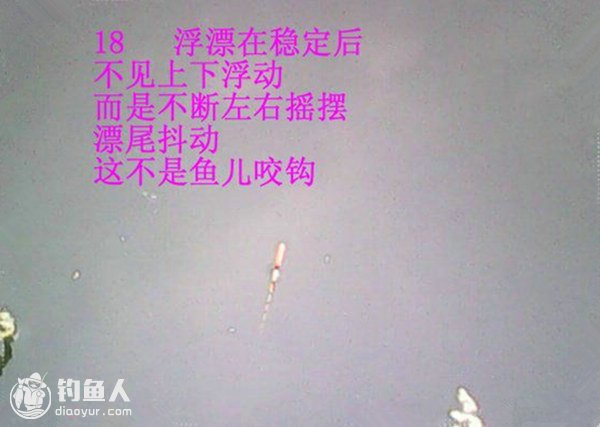 浮漂在稳定后,不见上下浮动,而是不断左右慢慢摇摆,时而漂尾抖动。这不是鱼儿咬钩的信号。前者是鱼在水体中下层游动、觅食引起水流、水压变化 影响到悬坠移位带动浮漂出现的信号;后者则是上层的小鱼在戏线、戏漂,均不可扬竿。