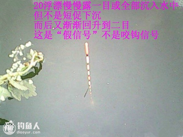 浮漂稳定 ,只见慢慢露一目或全部沉入水中,但不是短促下沉。而后又渐渐回升到二目。这是“假信号”不是咬钩信号。常是由于母线本压入水中,受风力影响牵压浮漂;或因水有缓流使浮漂不稳定。此时不要扬竿,应设法把母线压入水中等稳定漂。