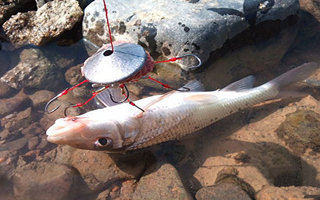 要使用圆饼形状的铅块,这个可以到鱼具店中购买。提示:铅块不能过于轻,重达30-40克重的铅块最好。有一定重量的铅块在水底的固定作用要明显得多,翻板翻转的效果也好,但是也不要过重,过重的铅块会影响上鱼的效果,因为在鱼的啄食下,翻板会慢慢陷入泥中,将鱼钩埋没,从而无法上鱼。一般的鱼具店都有买,有条件的也可以自己做。