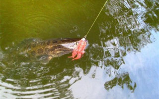 也有人疑惑:为什么有黑鱼攻击雷蛙,扬竿却屡屡不中鱼呢?我有一次在野塘路黑鱼,两小时内遭遇二十多次攻击却一条未中,后来总结原因:一是池塘中的黑鱼较多,二三两的小黑鱼池塘边随处可见,那些只见攻击而不中的大多是小黑鱼。二是手法和扬竿时机不准。黑鱼在发起攻击时是先观察,然后靠近,找准时机一口吞下。黑鱼的这一攻击习惯决定了路黑鱼的手法,轻抽、停顿两到三秒,然后再轻抽、停顿,要让黑鱼有足够的时间发现雷蛙并靠近攻击。