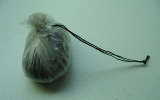 1)采用塑料薄膜包住石坠后,将四周边角收紧,用鱼线或棉线糸牢。余下的线段应有六厘米长,在六厘米的未端打一防滑死结。使用时,防滑死结糸在主线的适当部位就行了。缺陷是:塑料薄膜不环保。