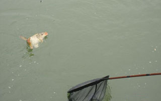抬竿中鱼以后不要急着去拿抄网,拿了也没用,先双手扶竿,溜鱼,别拔河,等到鱼露头了再去拿抄网不迟,不露头着急也没用。
