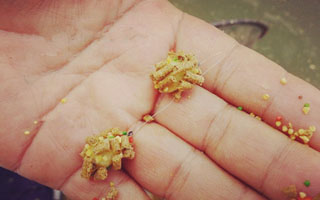 在用颗粒做基础的饵料时,首先需要将颗粒用水泡开,然后再根据自己的需要添加进其他的辅助饵和状态饵,之后再加水搅拌等步骤。泡颗粒的过程虽然简单,但也需讲究技巧,首先,颗粒一定要完全泡开,用手轻揉,要确保不能有还未化开的硬心存在。加水量以在容器内刚好没过颗粒表面为好。完全泡开的颗粒饲料用手感觉含水量应以潮湿感并用手指捏团 挤不出水分为佳。如果泡制的颗粒达不到以上的状态,则会直接影响到制成后钓饵的状态,其效果也会大打折扣了。