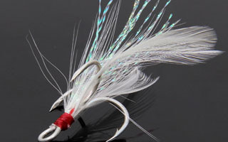 还有一部分带亮片的钩,因为其独特的造型必须配合水阻大的尾部力量才能产生效果,这时候就必须换带毛的单钩(毛的作用主要是产生尾部阻力使其亮片产生左右大幅度的来回摆动其次才是吸引鱼类。)