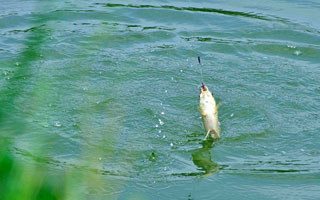 如果鱼在二三两以上怕伤子线,中鱼后先牵鱼到水面,贴水面拖回一半距离后再大臂带小臂及手腕同时发力,提鱼出水。