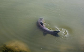 每到清晨,水部底下及水草丛中都会隐隐出现几条一米来长黑色的大鱼身影,在游动寻食中不时地发出咯、咯、咯的响声,一会儿从大鱼嘴中又吐出螺蛳壳、蚌蛤壳碎片,……远处从水面上传来一些声响,大鱼马上惊觉快速游向深水区躲藏起来。这是一群生活在深水中的大青鱼。