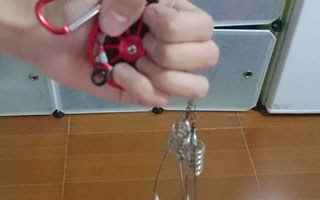 然后把别针大头扣到轮子中如图的位置。有点难,弄个镊子会好办很多。注意把没用的线头剪掉否则影响收线。