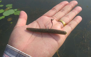 使用裸钩时可以根据水深和鱼情在距钩子处不同的距离上加装适当重量的咬铅甚至子弹铅,或者在虫身安装插铅以改善面条虫在水中的飘落状态。当抛投无铅或者微重wacky钓组时建议使用L-ML硬度的直柄竿,配10磅以下PE线加碳线前导或直接选用碳氟线,针对水草杂物较多的标点抛投铅头钩、子弹铅wacky钓组时,可使用枪柄竿实现精准抛投。