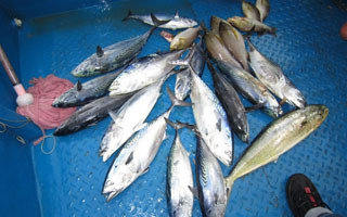 甩、收,甩、收。鱼咬钩了,弓鱼。不咬,继续甩、收,甩、收。这阵,是大家收获的主要阶段,累了,换人休息一下,再来。我跑的比钓的多,中了五条,只上来两条,都是烟仔。三条弓的时候脱钩了。就这样,也不知搞了多久,到最后大家都精疲力尽了,甩不动了。于是,还是用省力的办法,拖吧,象早上一样,拖马鲛吧。