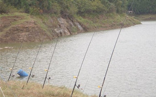 在水库较陡峭的岸边,只要有能让人站稳的小地方,便能下竿垂钓。在此垂钓要特别注意安全,鱼竿要支牢以免鱼拖竿入水难以打捞。