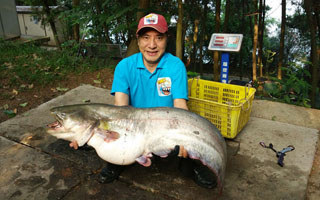好在去年就用这支竿子上过巨鲶的经验,但我也很清楚Lurelerder15年“决”702MLS的韧性好、腰力强。只有竿子不是死角度,就一定能够将鱼拉上岸边。慢慢的弓、慢慢的收,希望早一点将鱼来出水面。也不知道和鱼拔河多久了,只听见站在我旁边帮忙的人说,我都来了20多分钟了还没有看见鱼出水。又用了10来分钟,终于在3人的帮忙下才将这条鱼擒住!大家纷纷的拿出手机开始拍照,好在我最近1个多月天天都在进行体育锻炼。不然的话,手臂早就酸麻了。