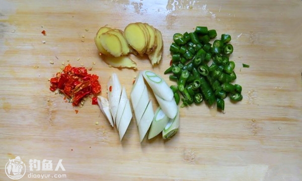 准备辅料,葱切段、姜切片、红辣椒切碎末、青蒜末(喜辣可换成辣椒末)