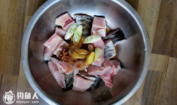 用料酒、蒸鱼豉油,几片葱花和姜片腌制1-2小时,腌好后将腌料倒掉,加入面粉,让每块鱼块都均匀的包裹着沾上一层干面粉。