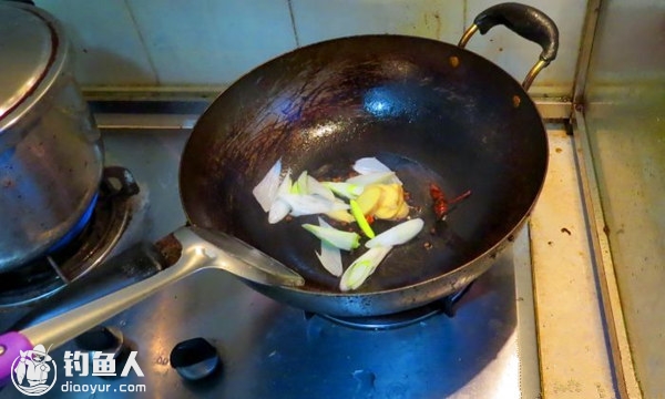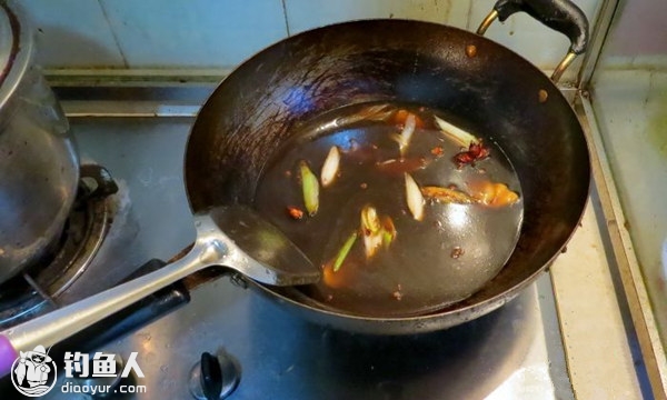 煎鱼的底油炒香葱、姜、辣椒、花椒、八角.