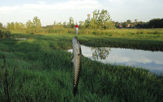 若看见饵后面有较大水花,多半是黑鱼注意到鱼饵,扭动身体,此时动作宜小而频。黑鱼攻击以后不用大力刺鱼即可中鱼,遛鱼时注意不要被黑鱼缠到水草上。