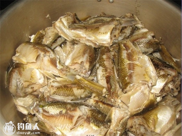 7)待蒸好的鱼温热时,剔除鱼主骨和大刺成为鱼肉,小刺将煸炒的酥碎,不会卡喉。