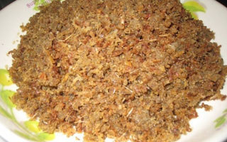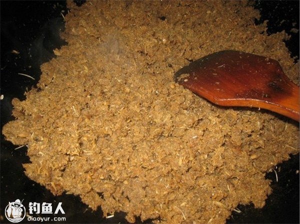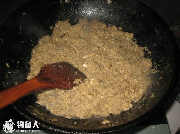 8)洗净的炒锅加入25克菜油烧至八成热,加入鱼肉进行翻炒随时注意和调整火的大小),直至水分基本炒干时就可以了。