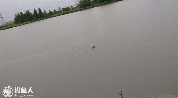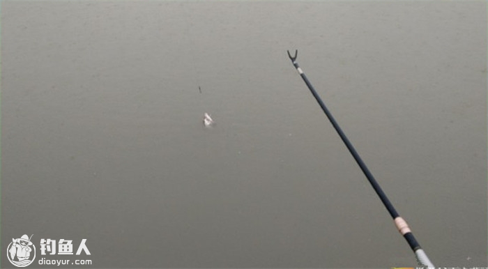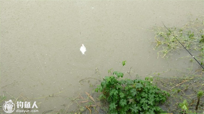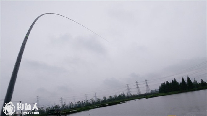 钓了三竿没有动静,于是又上拉漂钓离底20公分,还是没口,离底10公分,有口,但有一个下顿空竿,继续下拉到离底约5-6公分时,口就明显了。几个晃动后一个明显的下顿二目,扬竿中鱼,鱼线发出嗡嗡地叫声,压低竿尾弓起竿。这鱼的力道好大,由于下着大雨,我也无法离开钓箱控鱼。