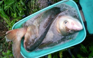 今天我钓两条鳙鱼,一条鳊鱼,还有几十条鲫鱼。鳙鱼称了,一条6斤3两,一条5斤,鳊鱼一斤一两。鲫鱼约5斤,总收获17斤多,应该算没亏本。老谢钓了一共四斤左右鱼。
