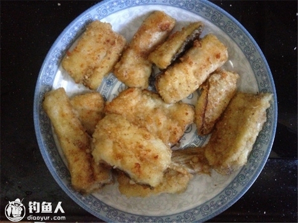 先切成鱼条,蘸生粉,生粉中混合了盐、五香粉和孜然粉