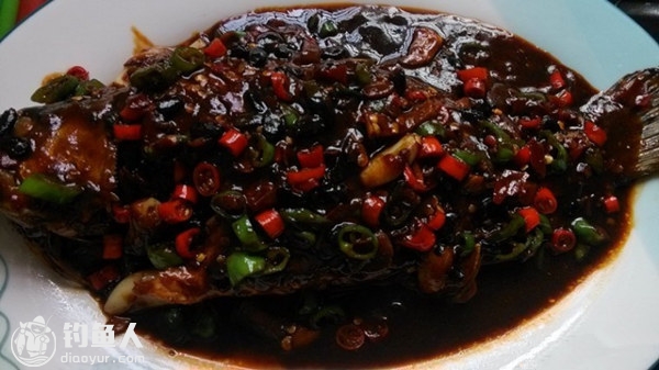 烧20分钟左右将鱼取出装盘,锅内留汁将红绿辣椒放入略拌一下后浇在鱼身上,端盘上菜。