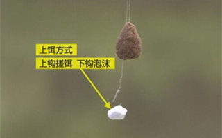 当然泡沫也有一个缺陷,就是不雾化、无气味、诱鱼力度不够,这时可以采用下钩挂泡沫、上钩搓饵蘸颗粒,或者搓饵带散炮的形式来续窝,以达到诱鱼留鱼的目的。