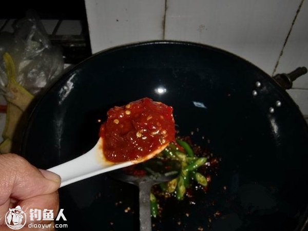 上锅热油,放入干辣椒炒香,再放郫县豆辨酱,炒至油呈红色起锅盛碗备用。