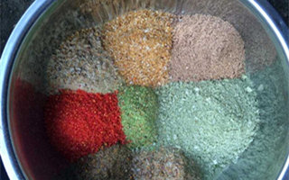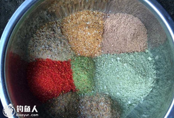 这两种颜色的饵料主要是各种颜色较浓的饵料调配制作出来的,像蚯蚓粉、芝麻粉、螺蛳粉、红虫粉本身色彩就艳丽,一混合在一起,色彩就更加浓厚。