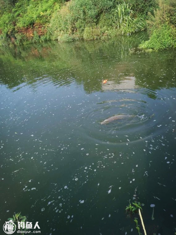 水很满,都浸到岸边的草,仔细观察,发现岸边的草有被草鱼啃食的痕迹,草鱼的食物很丰富,浮钓草鱼有一定的难度。去年这个季节相同水位,草鱼很多,水边的草、竹叶、芦苇叶常见被草鱼拖拽啃食,发出沙沙的声响,现在看不到了。