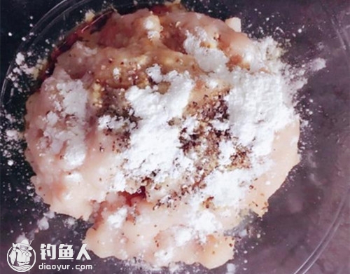 (3)在打好的鱼泥中加入蛋清,1勺料酒、2勺酱油,1勺淀粉,少许盐和胡椒粉搅拌均匀。