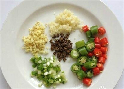 (2)青、红尖椒小粒,准备花椒、葱花、姜末、蒜末。