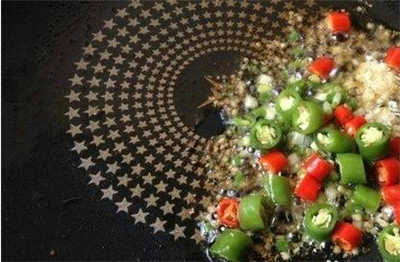 (6)放入姜末、蒜末、葱花、青红尖椒,小火煸出香味。