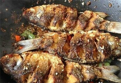 (8)将炸制好的鲫鱼下入锅中,倒入少量水焖2分钟即可。