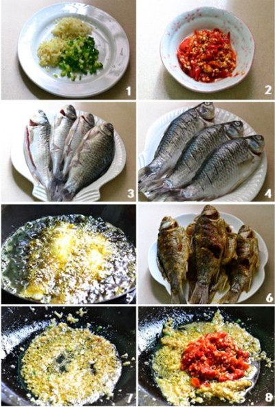 小鲫鱼4条、泡椒(酸)4个、生姜1块、大蒜3粒、香葱2根、酱油1汤匙、醪糟1汤匙、醋少许、食用油、水淀粉少许、红油(辣椒油)1汤匙。